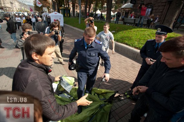 Спор с бойцами «Беркута» переросла в драку. В конце концов правоохранители отобрали палатки и окружили сторонников Тимошенко, чтобы они не смогли повторить попытку их установить.