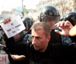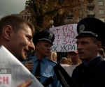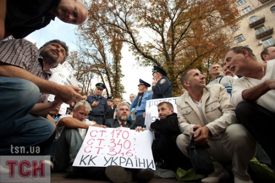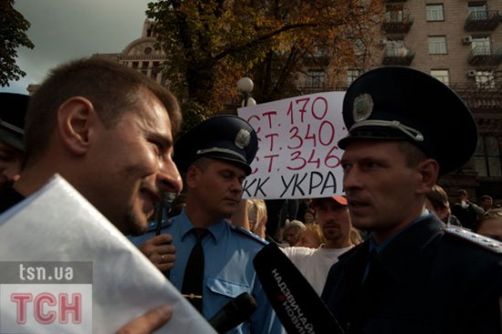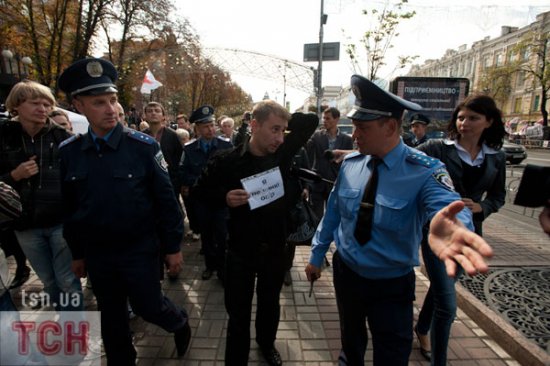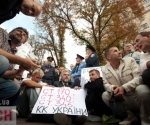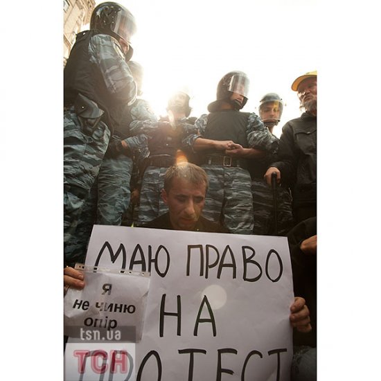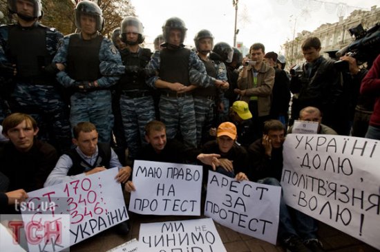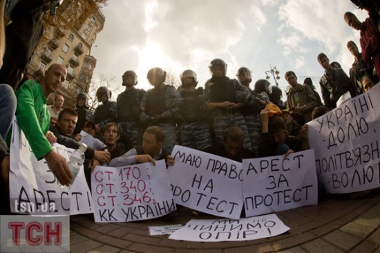 «Беркут» силой не дал сторонникам экс-премьера Юлии Тимошенко установить палатки на ее поддержку на Крещатике напротив Печерского суда у здания Национального союза журналистов Украины.