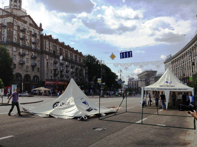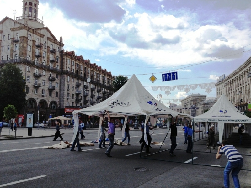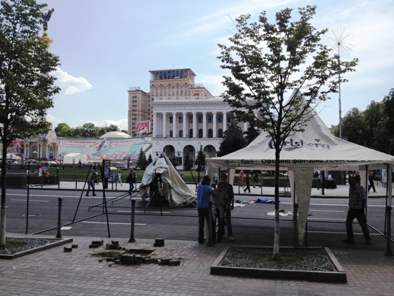 В Киеве начато строительство главной фан-зоны Евро-2012. Сейчас движение по Крещатику перекрыто и проходит установка торговых павильонов. Напомним, что открывать фан-зону будут 7 июня, всех гостей торжества будут ждать гала-концерт, яркое шоу и грандиозный фейерверк.
