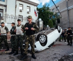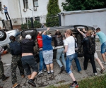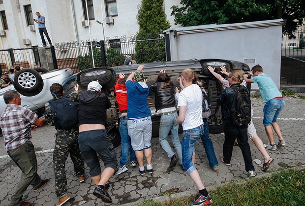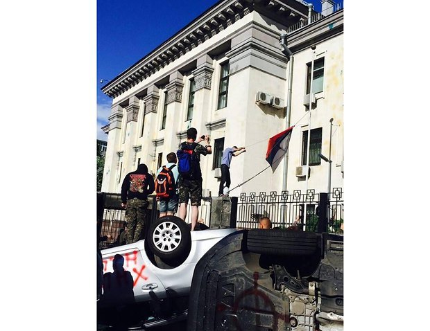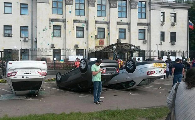 Как сообщили в эфире Hromadske TV, пока участники акции протеста забрасывают здание посольства камнями, разбирая мостовую перед зданием, в ход также пошли дымовые шашки. В здании разбито несколько окон.