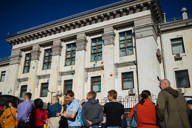 Посольство РФ в Киеве забросали яйцами, с него сорвали российский флаг (Фото)