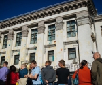 При этом участники мероприятия не совершали никаких действий, которые можно квалифицировать как надругательство над государственной символикой иностранного государства. Митинг у посольства РФ продолжается. Люди прибывают.