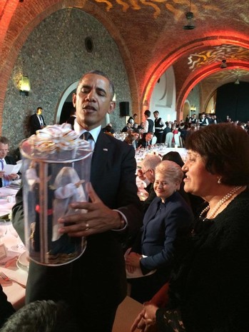 Мирослава Гонгадзе прокоментировала в Facebook фотографии с праздничного ужина: «Порошенко по правую руку от Обамы…Через три человека. Праздничный ужин в честь Джемилева».