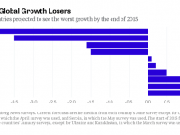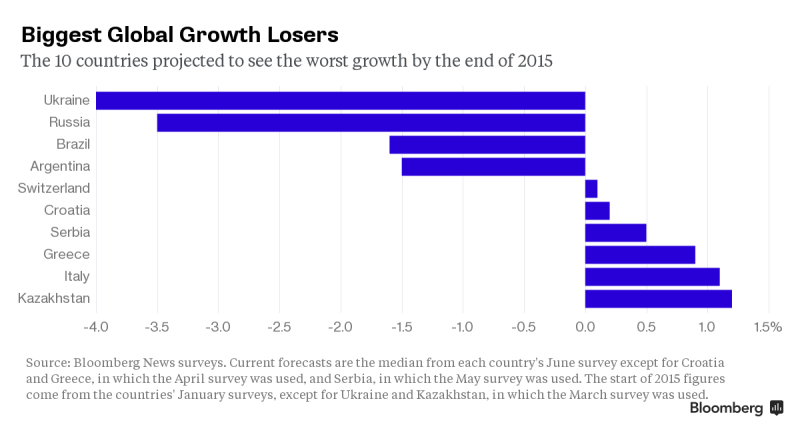 Украина к концу текущего года покажет худшие результаты роста ВВП из 47 ведущих экономик мира. Такой прогноз на основе открытой информации делает агентство Bloomberg, предрекая падение украинского ВВП на 4%. Предпоследнее место среди экономик-неудачниц заняла Россия, чей ВВП сократится на 3,5%. Причиной экономических проблем России эксперты назвали санкции Запада и падение цен на нефть.