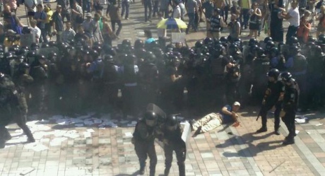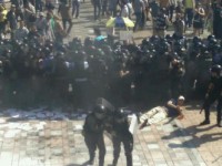 После этого в милицию бросили, по предварительным данным, боевую гранату. По другой информации, взорвался взрывпакет, начиненный гайками. На земле остались лежать минимум три бойца, площадь перед парламентом — в крови. Есть пострадавшие, которые сумели уйти сами.