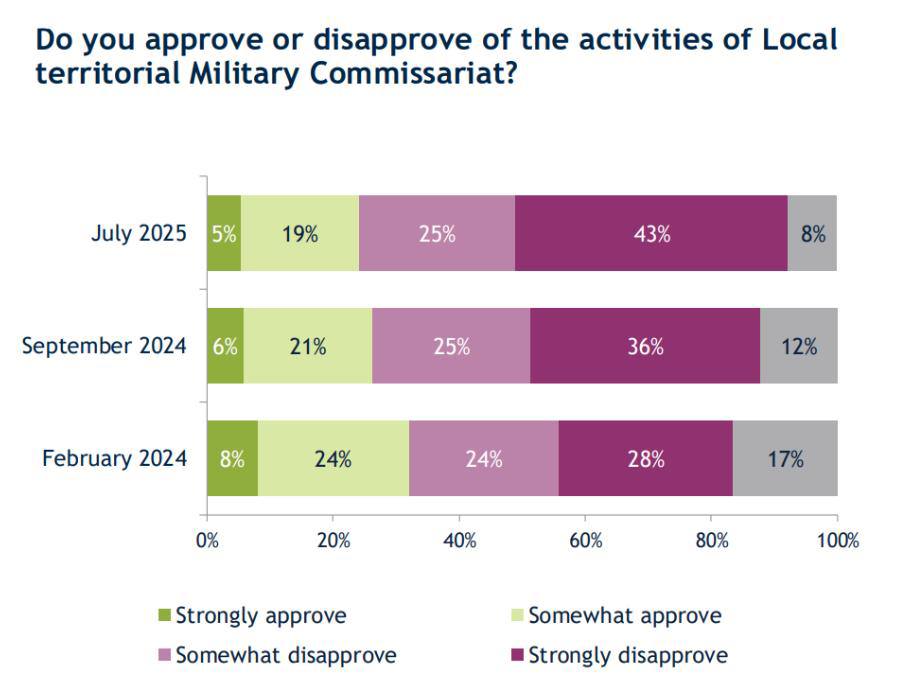 В июле 2025 года доверяют ТЦК четверть опрошенных (24%), а не доверяют — 68%. Например, в сентябре 2024 года ТЦК доверяли 27% респондентов, а не доверяли — 61%.