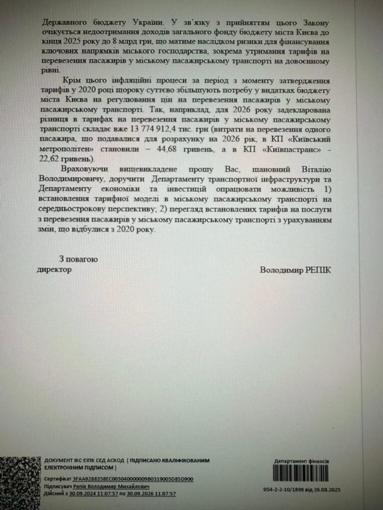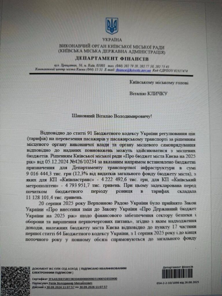 Ось документ Департаменту фінансів КМДА в якому чітко сказано: 8 млрд, мали йти, в тому числі, на транспорт, дороги, школи, лікарні. Ці гроші Банкова вкрала у киян. Київ не може підтримувати старі тарифи на проїзд, бо створена «слугами» бюджетна дірка – величезна.